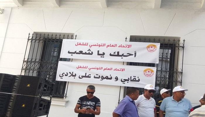 وقال الطاهري “رسالتنا اليوم أنّ الاتحاد لا يرهب ولا يخاف ولا يتردّد في الدفاع عن العمال وكيان المنظمة”، مؤكدا أن الاتحاد سيواصل الدفاع عن النضال المدني والسلمي.