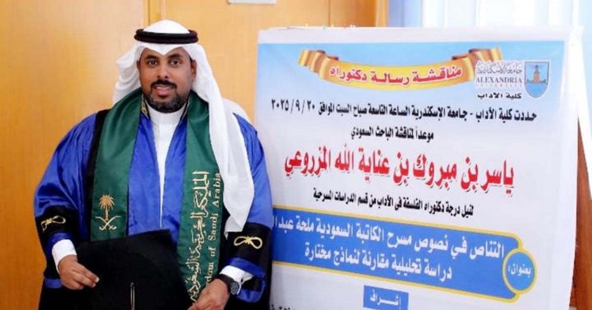 حصل الدكتور ياسر بن مبروك بن عناية الله المزروعي على درجة الدكتوراه في الدراسات المسرحية من كلية الآداب بجامعة الإسكندرية، بعد مناقشة أطروحته العلمية التي جاءت بعنوان: “التناص المقارن في نصوص مسرح الكاتبة السعودية الدكتورة ملحة عبدالله – دراسة تحليلية”.