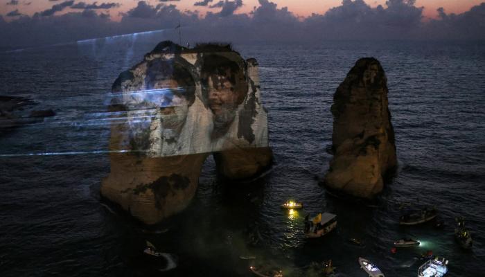 حزب الله يتحدى حكومة لبنان ويضيء صخرة الروشة في العاصمة بيروت بصورتي الأمينين العامين السابقين للحزب، حسن نصر الله وهاشم صفي الدين.