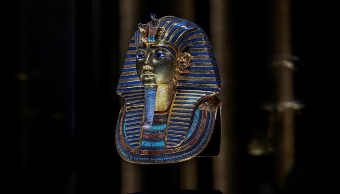 يتوسط القناع الذهبي الشهير للملك، الذي حكم مصر قبل أكثر من ثلاثة آلاف عام، قاعة ضخمة خافتة الإضاءة، محاطًا بكنوز مذهبة تضم مقتنيات أسرية وأدوات مطلية بالذهب وعشرات التماثيل الجنائزية.