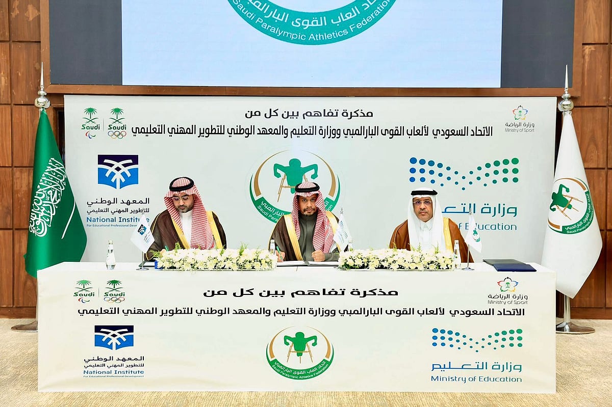 وقّعت وزارة التعليم مذكرة تفاهم مع كلٍ من الاتحاد السعودي لألعاب القوى البارالمبية والمعهد الوطني للتطوير المهني التعليمي، بحضور وكيل الوزارة للتعليم العام الدكتور حسن خرمي، ورئيس مجلس إدارة الاتحاد الأستاذ عبدالرحيم آل الشيخ، ومدير عام المعهد الأستاذ عبدالله العودة، وذلك في مقر اللجنة الأولمبية والبارالمبية السعودية بالرياض.