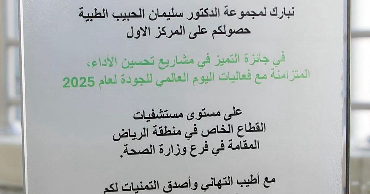 حصلت مجموعة الدكتور سليمان الحبيب الطبية، ممثلة في مستشفى الدكتور سليمان الحبيب بالريان، على المركز الأول في جوائز التميز لمشاريع تحسين الأداء وسلامة المرضى على مستوى مستشفيات القطاع الخاص بمنطقة الرياض، وذلك ضمن فعاليات اليوم العالمي للجودة لعام 2025م، التي أقيمت بفرع وزارة الصحة في الرياض.