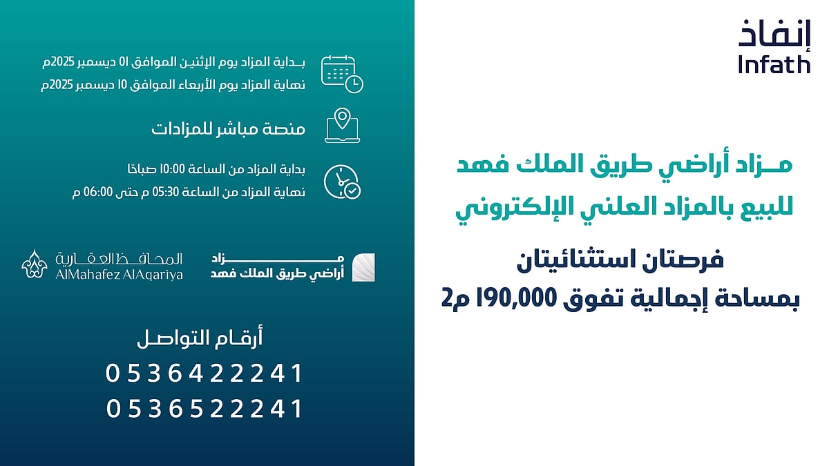 يطرح المزاد اثنتين من الفرص العقارية الاستثنائية تتميز بموقعها الاستراتيجي على طريق الملك فهد شمال العاصمة الرياض، بمساحة إجمالية تتجاوز 190,000 م2 تتصدرها أرض زاوية خام بواجهة شرقية على طريق الملك فهد بمساحة 187,827.20 م2 في حي القيروان، بالإضافة إلى أرض زاوية خام بواجهة شرقية على طريق الملك فهد بمساحة 8,163.77 م2 في حي العارض.