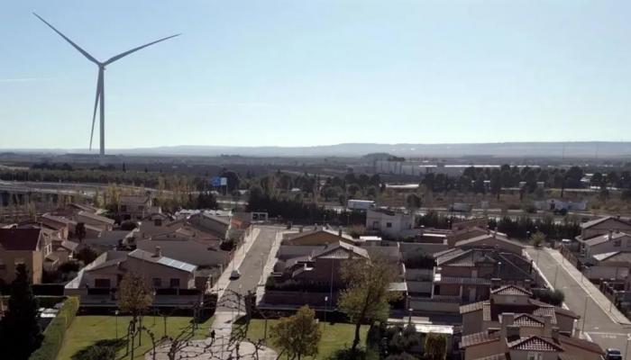 على مشارف بلدة فيغيرويلاس الإسبانية الهادئة، تدور توربينة رياح ضخمة، تلقي بظلالها على المباني المجاورة. إنها تذكير بأهمية الطاقة المتجددة في هذه المنطقة العاصفة من أراغون، شمال شرق إسبانيا، حيث تضم سهولها العديد من مزارع طاقة الرياح والطاقة الشمسية.