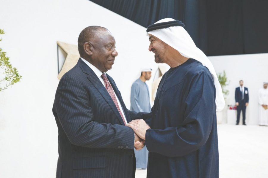 بحث صاحب السمو الشيخ محمد بن زايد آل نهيان رئيس الدولة “حفظه الله” وفخامة سيريل رامافوزا رئيس جمهورية جنوب أفريقيا أمس..علاقات التعان بين البلدين وسبل تعزيزها في مختلف المجالات خاصة الاقتصادية والتجارية والتنموية والاستدامة.. وذلك على هامش فعاليات “أسبوع أبوظبي للاستدامة2026 ” التي تقام في مركز أبوظبي الوطني للمعارض “أدنيك”.
