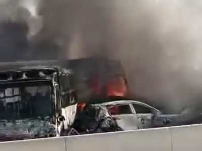 وننشر الصور الأولى للحادث الذى التهمت النيران فيه 6 سيارات من بينهم أتوبيس و3 سيارات ملاكي وسيارة نقل ثقيل، ويقوم رجال المرور بسحب الكثافات المرورية على طريق اسكندرية الصحراوى لتيسير حركة المركبات .