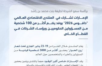 تشارك دولة الإمارات في الدورة الـ 56 لاجتماعات المنتدى الاقتصادي العالمي للعام 2026، التي تنطلق في دافوس بسويسرا غدا وتستمر…