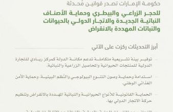 حكومة الإمارات تصدر قوانين مُحدثة للحجر الزراعي والبيطري وحماية الأصناف النباتية والحيوانات المهددة بالانقراض
