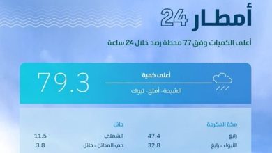 تبوك تتصدر أمطار المملكة بـ79.3 ملم و77 محطة ترصد الهطولات في 6 مناطق