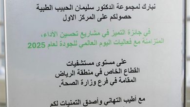 حصلت مجموعة الدكتور سليمان الحبيب الطبية، ممثلة في مستشفى الدكتور سليمان الحبيب بالريان، على المركز الأول في جوائز التميز لمشاريع…