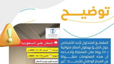 نفى المركز الوطني للأرصاد صحة المقطع المتداول لأحد الأشخاص، الذي تحدث فيه عن توقعات بهطول أمطار متوالية لمدة 45 يومًا…
